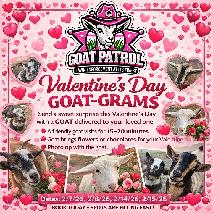 ππ Valentineβs Goat-Gram is here! ππ Surprise your special person with a 15β20 minute goat cuddle visit β snuggles, smiles, and photo-ready fun! Packages: π Goat-Gram Visit 20 minβ $50 πΉ Visit + Flowers OR π« Chocolates β $89 π Visit + Flowers + Chocolates β $109 Additional mini goat $20 each 30min $65 Dates: 2/7, 2/8, 2/14, 2/15 Times: 8 AM β 6 PM Spots are limited β book now! βBecause flowers fadeβ¦ but goat cuddles are forever.β ππ